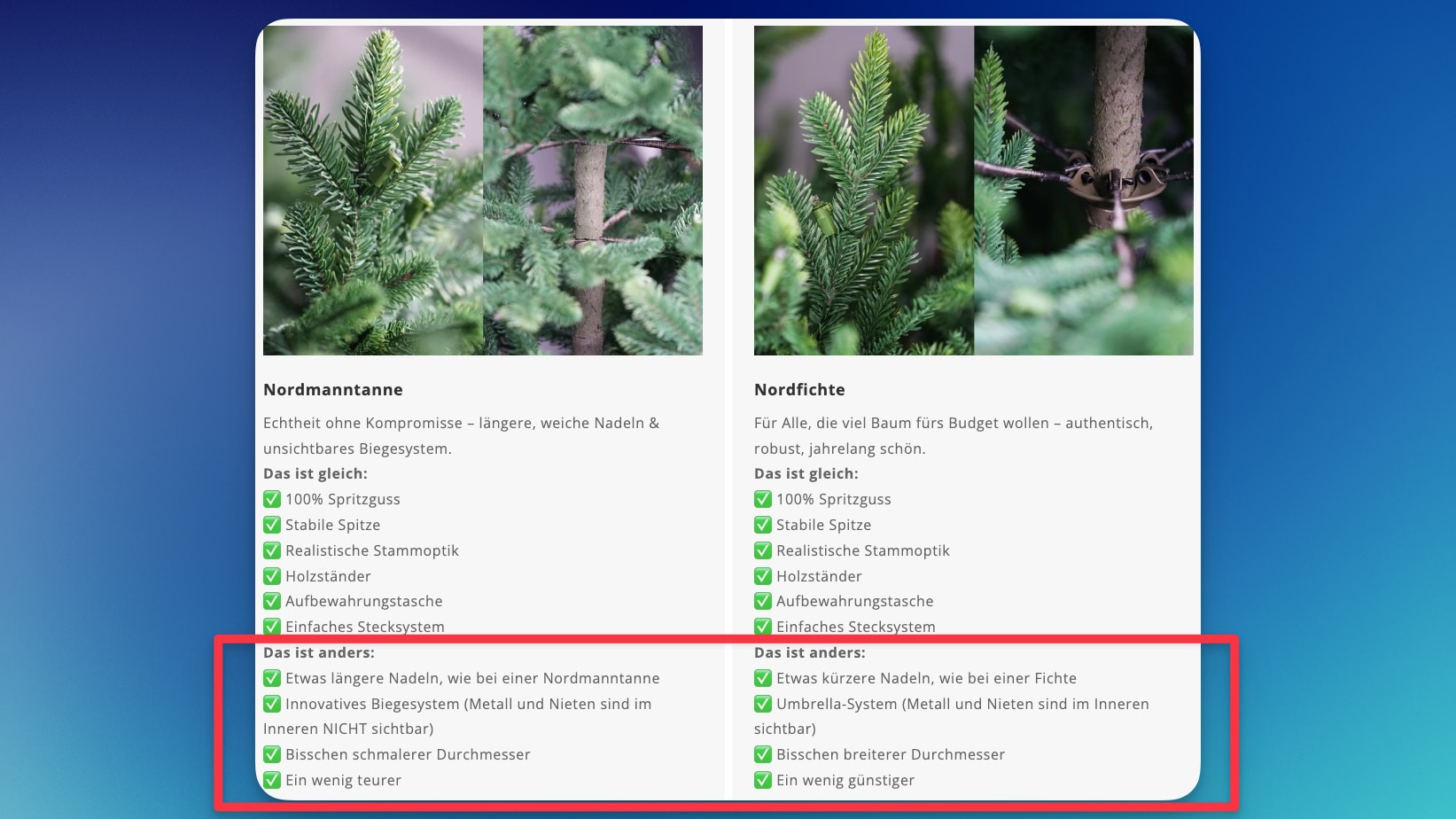 Die Nordmanntanne ist nochmal etwas hochwertiger verarbeitet. Die Nadeln sind ringsum sehr detailliert ausgearbeitet. Es gibt hier keine „Rückseite“. Außerdem ist das Material dicker. Damit fühlt es sich hochwertiger an – ob das nach 10 Jahren einen Unterschied macht – vermute nicht. Du musst einfach immer sorgsam mit dem Baum umgehen. Dann hält der dir in jeder Qualität „länger“.
