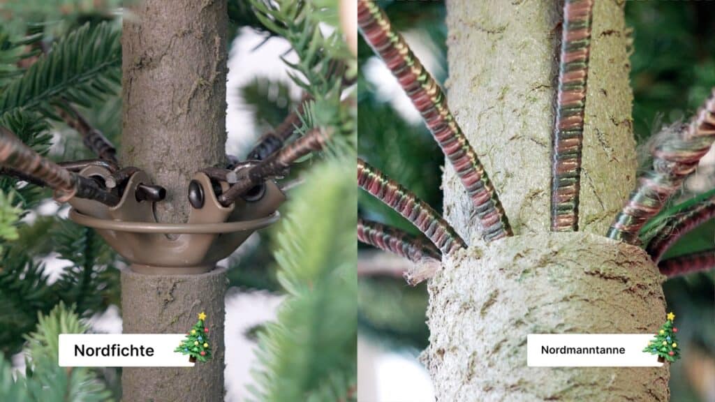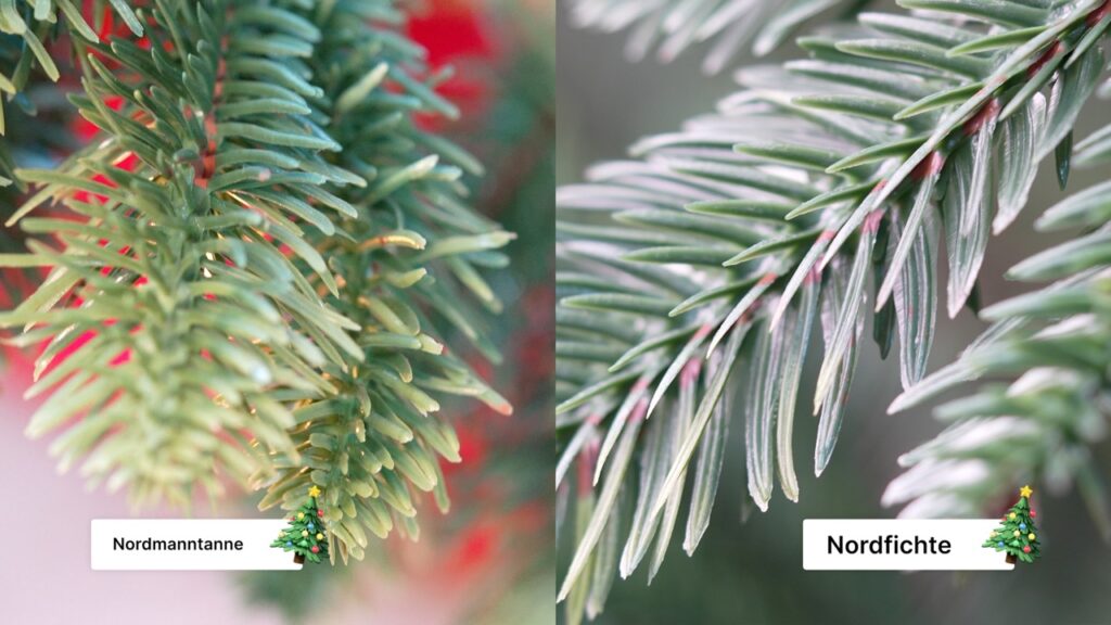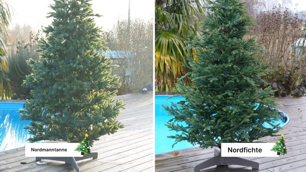 Erst im direkten Vergleich fällt wirklich auf, dass die Nordfichte unten etwas breiter ausfällt. Das ist beim Schmücken als Weihnachtsbaum hiemlich auffällig. Vielleicht sogar besser, weil du dann die Kugeln weiter außen anhängen kannst. Beim der Nordfichte steht eine Kugel unten am Zweig dann eher auf.