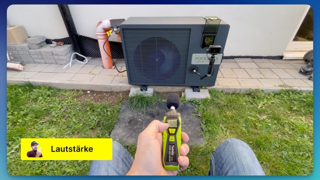 In meinem Setup ist die Wärmepumpe angenehm leise. Natürlich will ich nicht bei Volllast den ganzen Tag den Lüfter hören – etwas weiter vom Pool muss die schon weg. Aber wir sprechen von ca. 55 dB maximal. Das ist gut ertragbar.