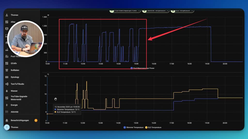 Solche Echtzeitdaten helfen mir enorm dabei, die reale Heizleistung und Effizienz der InverPRESTIGE einzuschätzen. Vor allem, wenn ich später unterschiedliche Betriebsmodi, Außentemperaturen oder PV-Überschuss vergleichen möchte. Ich übe mich noch im Home Assistant und werde in kommenden Beiträgen und Videos sicher noch präzisere Auswertungen zeigen.