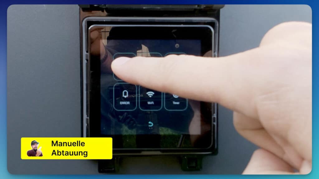 Dazu drückst du im Einstellungsmenü lange die „Programm“-Taste links oben. Dann startet der Entfrostungsmodus.
