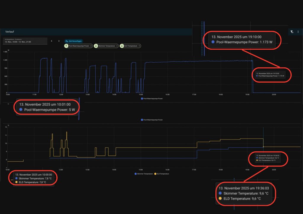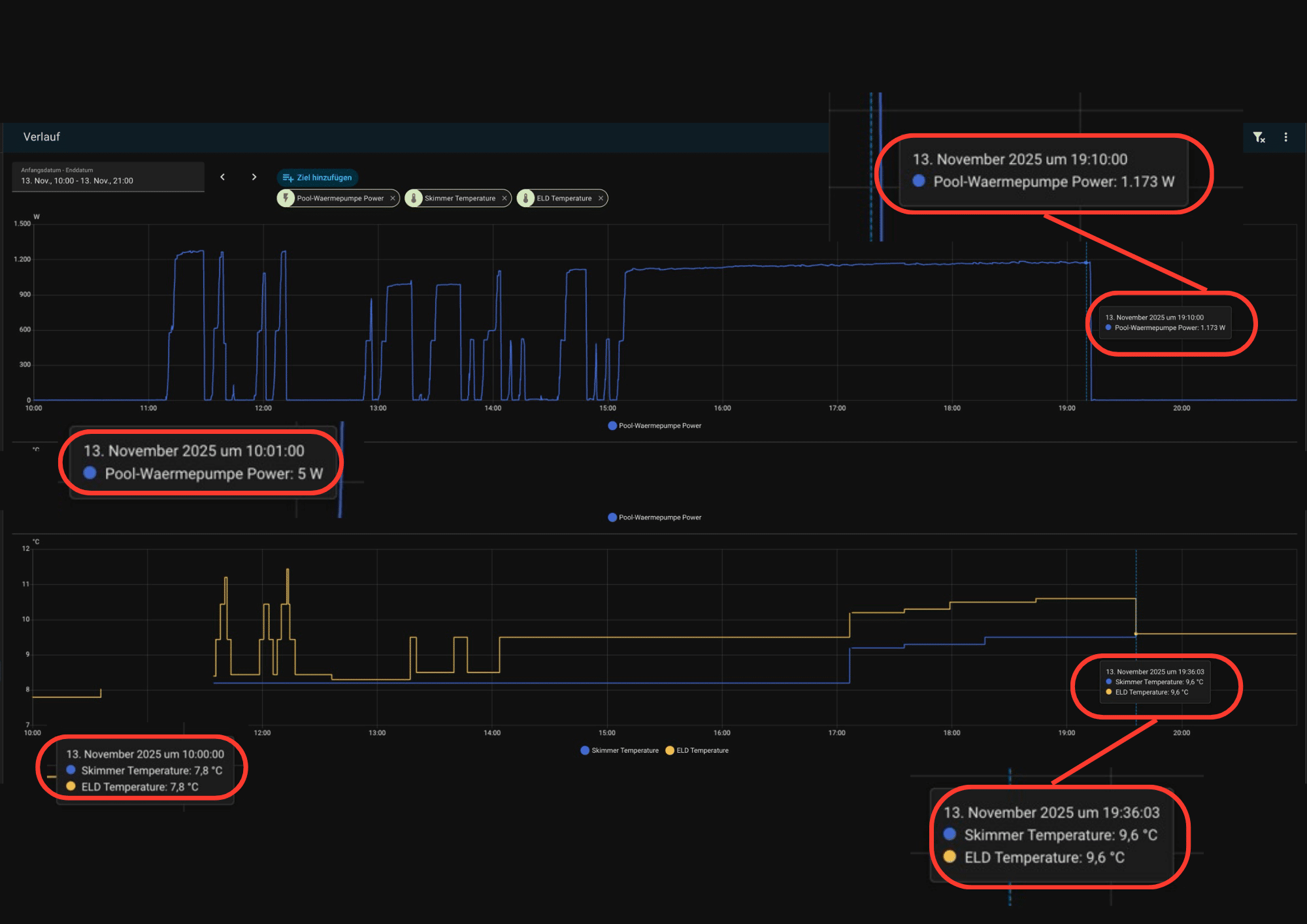 Das relevante Zeitfenster vom 13. November 2025 startet um 11:08 Uhr und endet um 19:12 Uhr – also eine effektive Laufzeit von etwas über 8 Stunden. In diesem Zeitraum ist die Wärmepumpe mehrmals angesprungen und hat dabei kurzzeitig bis zu 1276,4 W gezogen.
