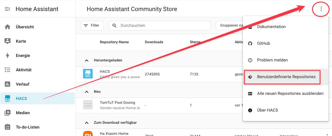 Gut, wenn du HACS in deinem HomeAssistant installiert hast, kannst du unter anderem jetzt meine Integration einbinden.