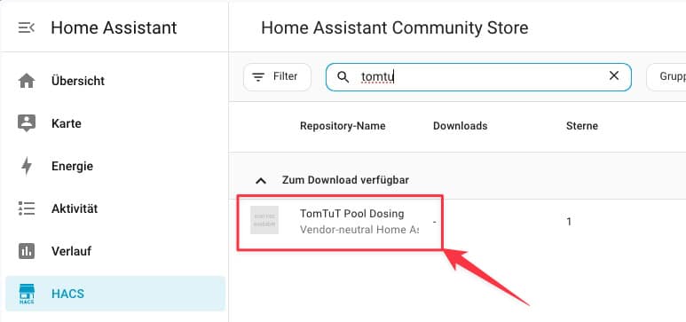 Nach dem Klick auf „Hinzufügen“ ist die „TomTuT Pool Dosing“ Integration im HACS sichtbar. Dort bitte draufklicken.
