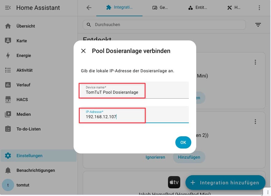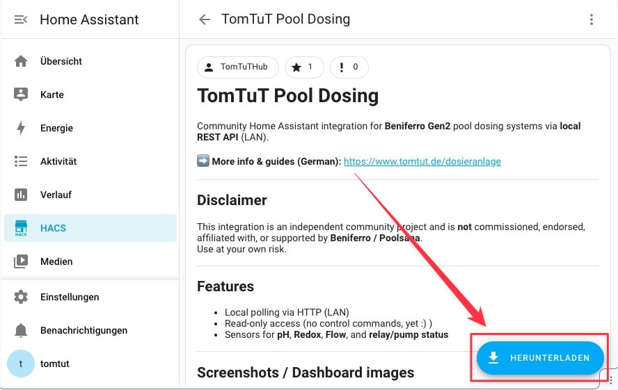 Nachdem die „tomtut-pool-dosing“ Integration bereitgestellt ist, muss die Integration noch offiziell in HomeAssistant installiert werden.