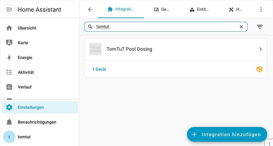 Wieder unter „Einstellungen“ – „Geräte & Dienste“ findest du jetzt die installierte und konfigurierte „TomTuT Pool Dosieranlage“ Integration.