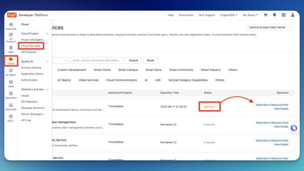 Navigiere dort unter <Cloud> <Cloud Services> Du siehst dann eine „Alert“ Meldung.