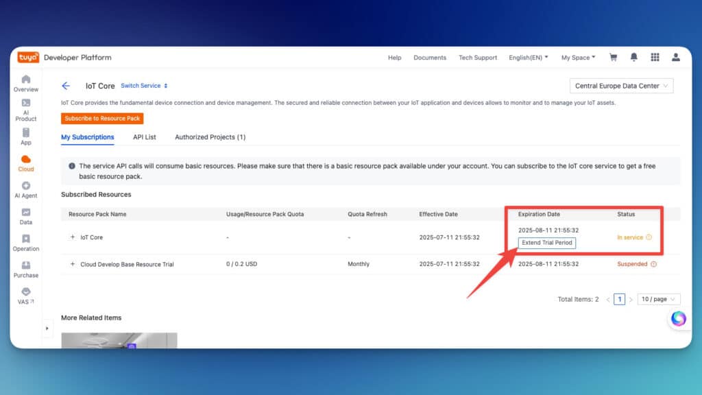 Klick bei „IoT Core“ auf <Extended Trial Period>