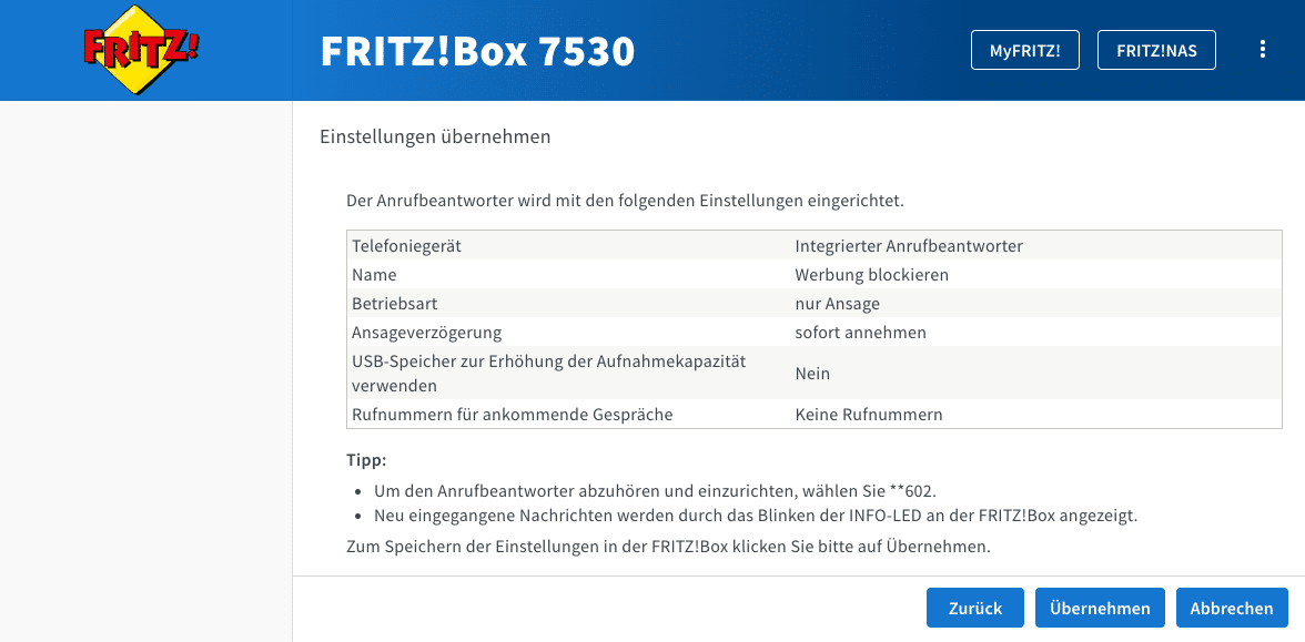 http://Fritz.Box » Telefonie » Anrufbeantworter » Weiterer Anrufbeantworter