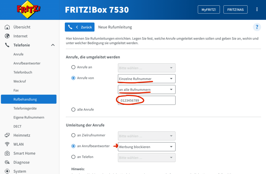 Einzelne Rufnummer hinterlegen